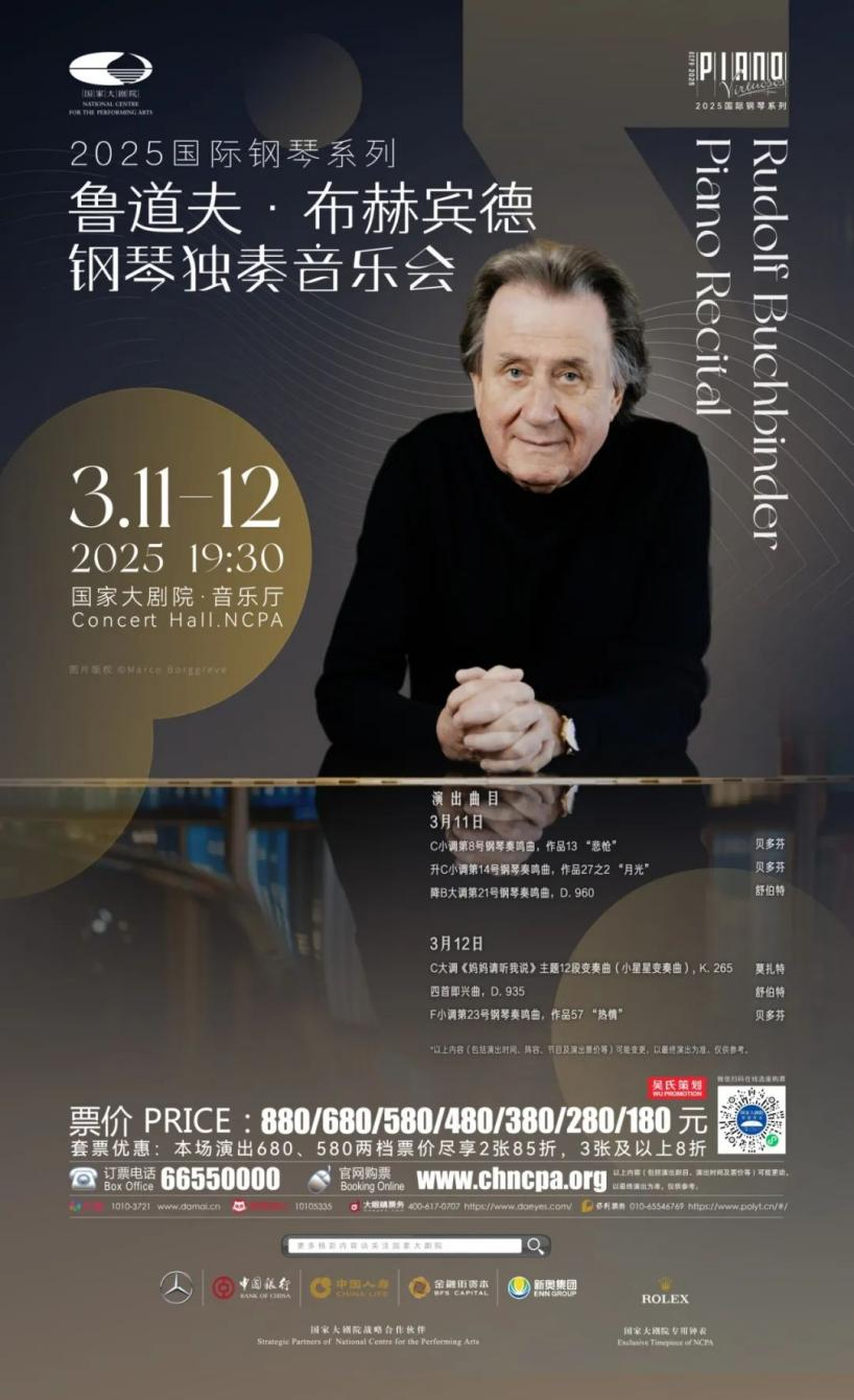The legendary pianist Rudolf Buchbinder will perform a selection of iconic works, including Beethoven's "Sonata Pathétique", "Moonlight Sonata", and "Appassionata", Mozart's "Twelve Variations on 'Ah vous dirai-je, Maman'", and Schubert's Impromptus.