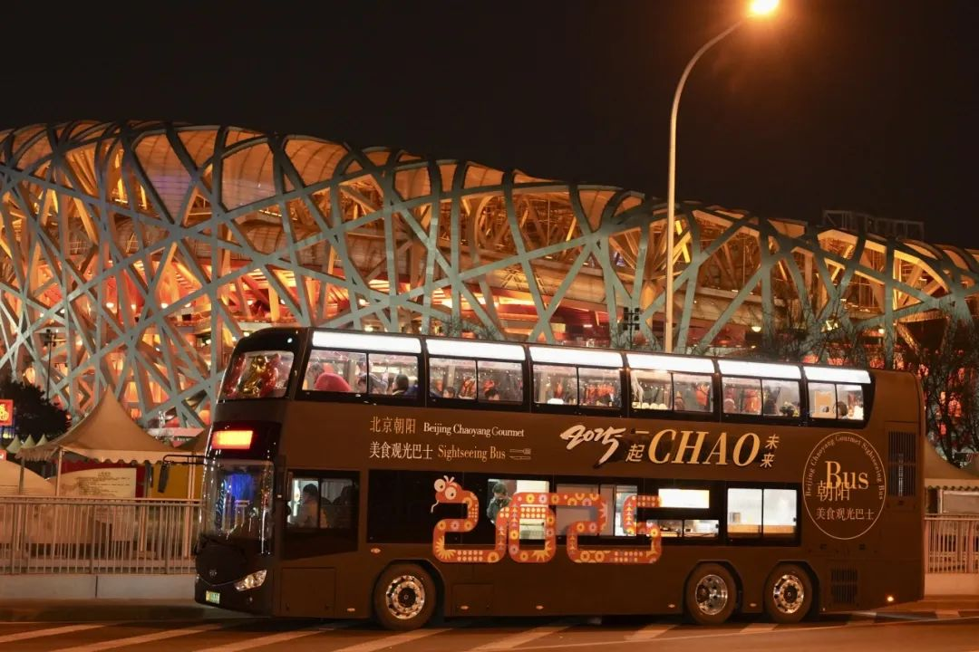 The Beijing Chaoyang Gourmet Sightseeing Bus covers a 40-kilometer route linking landmarks such as the CBD, Liangma River, Sanlitun, the "Bird's Nest", the "Water Cube", and the Olympic Tower, with a total sightseeing duration of approximately 2.5 hours.