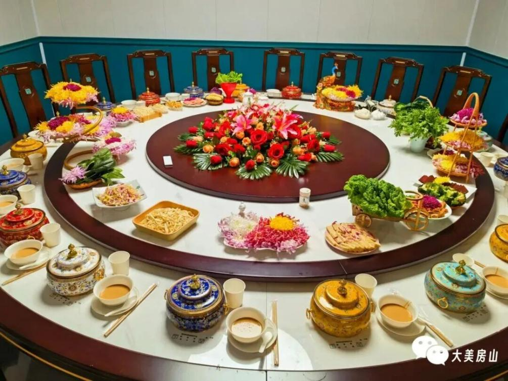 Looking for something distinctive? Try Fangshan's chrysanthemum banquet. It highlights fresh edible chrysanthemum flowers paired with seasonal vegetables, meats, and seafood. The golden, fried chrysanthemums are crispy on the outside and tender inside, while the refreshing chrysanthemum salad offers rich layers of flavor.