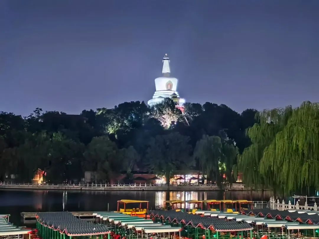 Beihai Park, located at the heart of downtown Beijing, ranks among the oldest and best-preserved imperial gardens in China. The park is surrounded by a vast lake. When night falls and lights are turned on, the White Pagoda on the Qionghua Islet is illuminated, casting a beautiful reflection on the glistening surface of the lake.