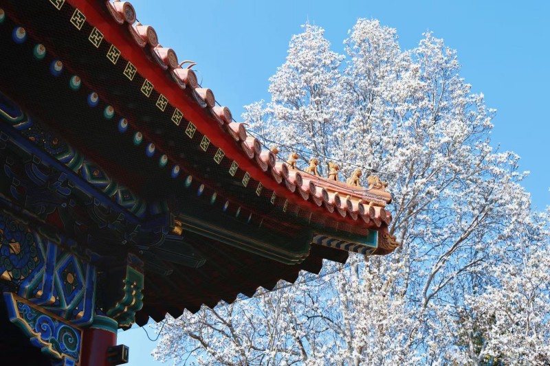 As gentle breezes fill the air, spring is unfolding across Beijing. The city's municipal parks have ushered in the annual flower-viewing season. At Jingshan Park, blooming flowers adorn the branches, set against red walls and historic architecture, creating a vibrant spring scene. Through the lens of Madelyn Arnold, a visitor from Canada, we can experience the romantic beauty of spring at Jingshan Park.