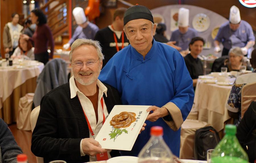 This undated file photo shows a foreign tourist posing for photos with a waiter in traditional costumes at the first-ever store of Quanjude on the Qianmen Street in Beijing, capital of China.