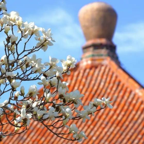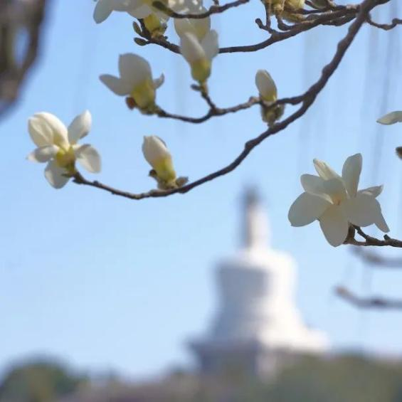 At Minor Western Heaven (Xiaoxitian), the magnolia flowers contrast beautifully with the golden glazed tiles, while the towering White Dagoba in the distance completes this picturesque spring scenery.