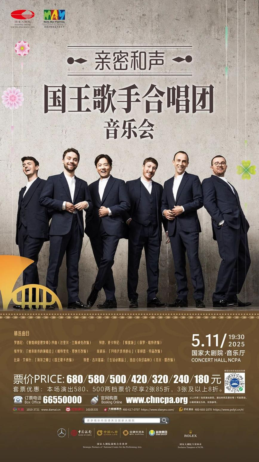 The King's Singers, established in 1968, are renowned for their innovative and unique arrangements and reinterpretations of various musical works. This concert will feature a diverse repertoire, including two Chinese songs: "She Came to My Concert" and "The Moon Represents My Heart".