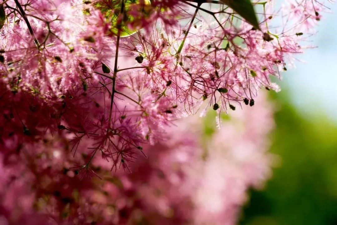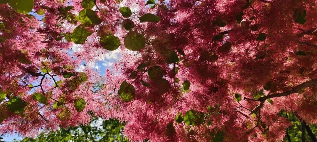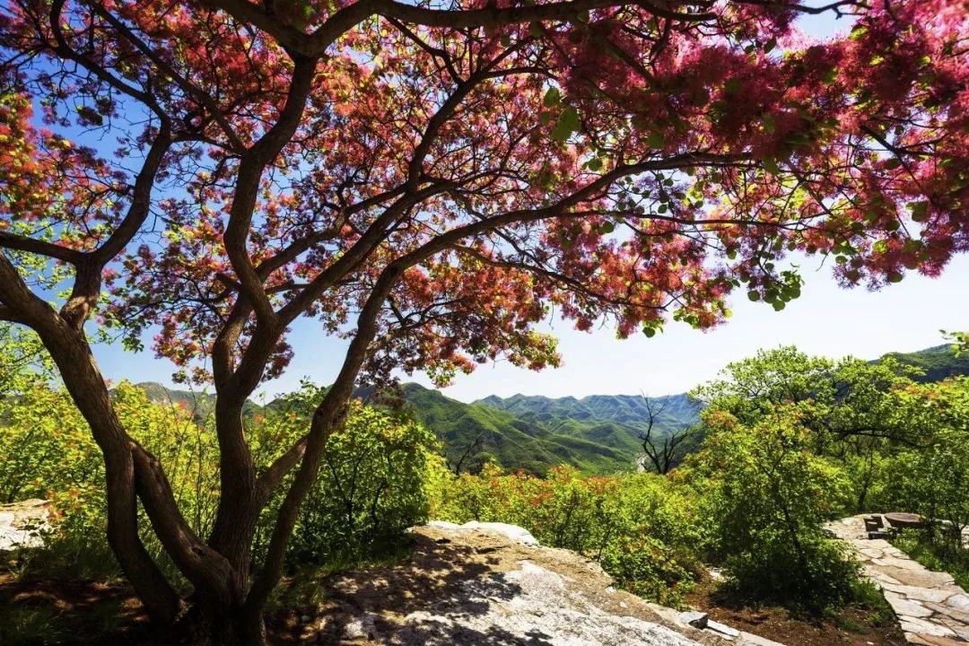 Recently, the 2,000-mu expanse of smoke trees at Pofengling in Beijing's Fangshan District has bloomed, with a mist-like sea of pink flowers stretching across the mountains. National Geographic has hailed it as "North China's most spectacular smoke tree viewing area".