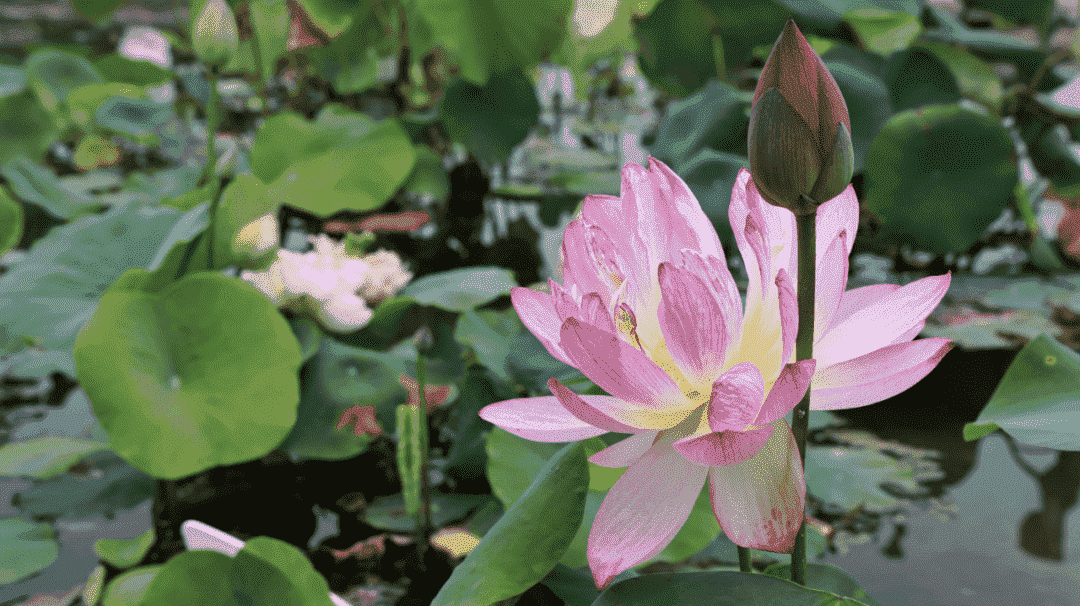 At the Beijing Garden Expo Park, pink and white lotus flowers in the Hangzhou Garden resemble clouds and snowflakes. These flowers beautifully complement the surrounding pavilions, rocks, and ponds, forming stunning Jiangnan-style ink paintings. In the Jiangsu Garden, lotus leaves spread densely across the water surface, creating a green sea, where dainty waterlilies bloom among the thick leaves.