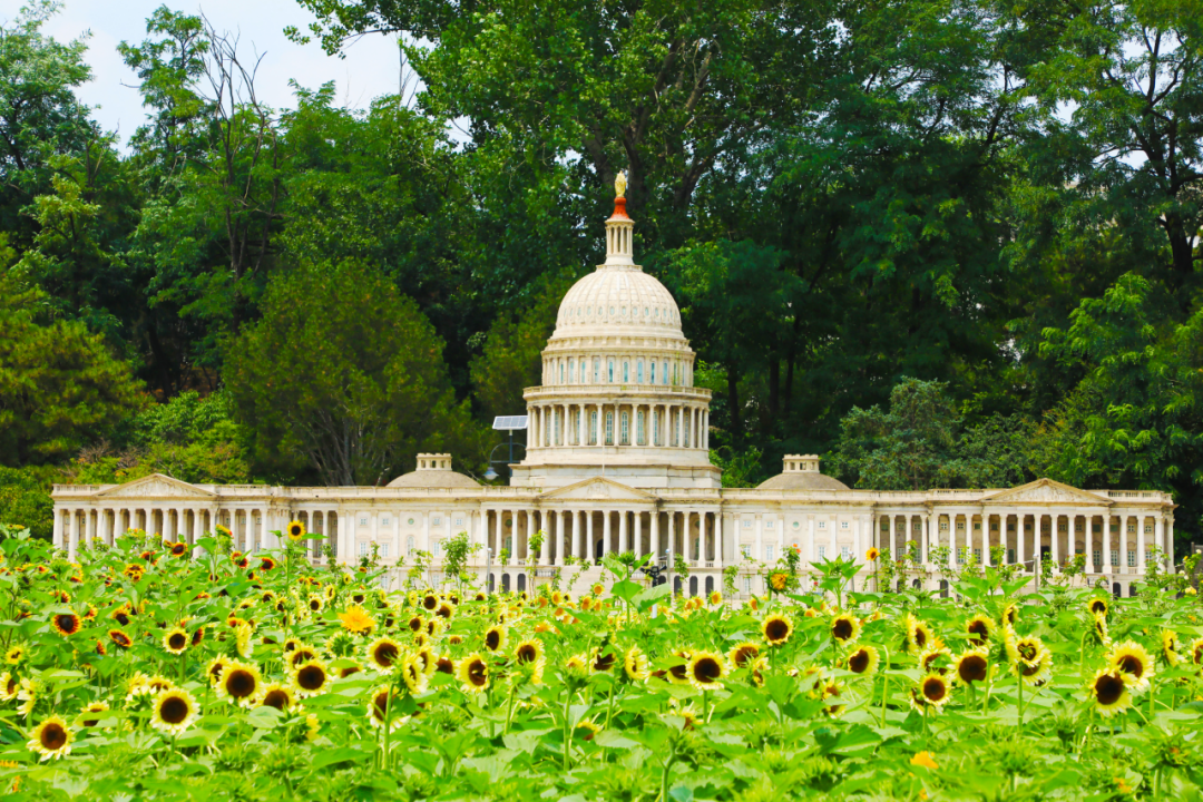 Recently, the hundred-mu sunflower fields in the Americas section of Beijing World Park are at their peak viewing period, with golden yellow waves of flowers framed alongside miniature American landmarks, creating a scene as beautiful as an oil painting.