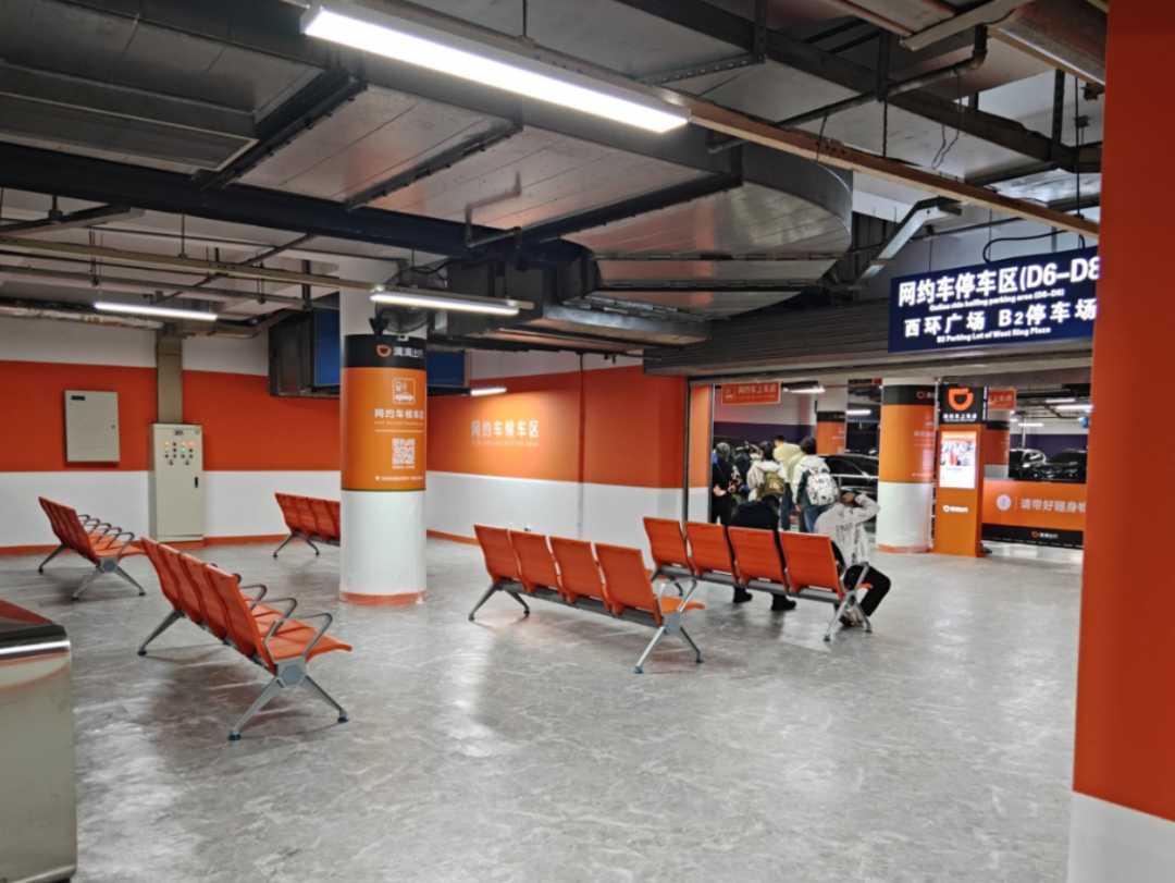 After exiting the station, walk straight ahead and follow the "E-hailing" (网约车) signs to take the escalator down to the lower level. Once there, turn right, then follow the flow direction signs heading towards Xihuan Square (西环广场) and the B2 Parking Lot to arrive at the pick-up area.