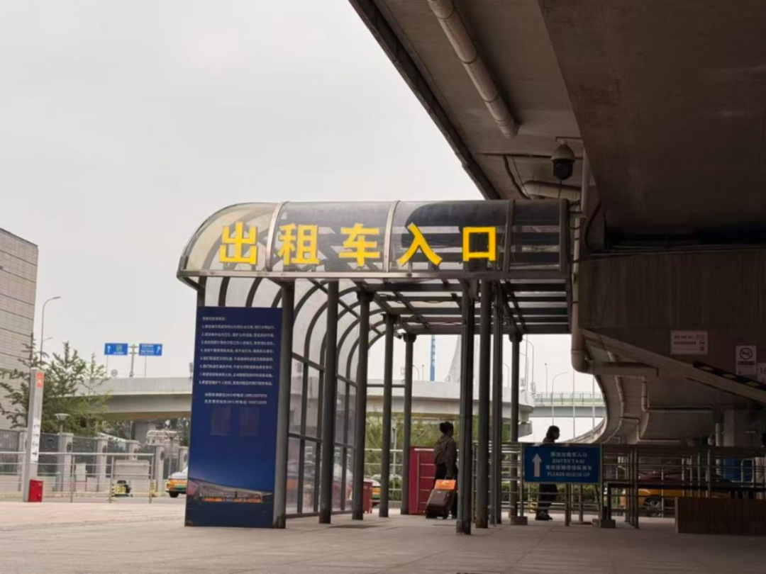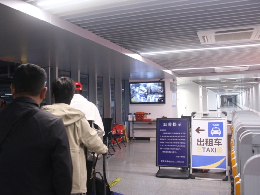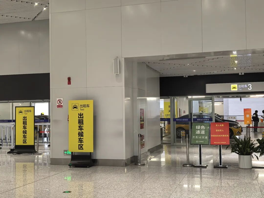 After exiting the station, walk straight ahead and follow the "Taxi" (出租车) signs to take the escalator down to the lower level. Once there, turn left as indicated by the flow direction signs to arrive at the pick-up area.