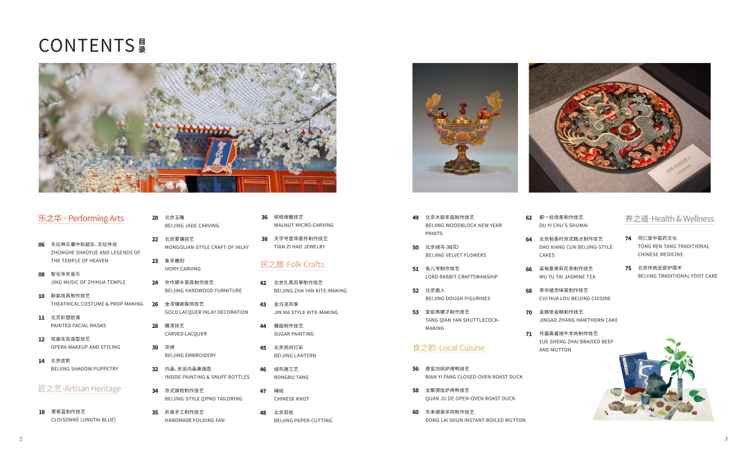 This guide outlines 42 intangible heritage projects suitable for integration with tourism in Dongcheng District, systematically categorizing them into five major categories. Chapter I on "Performing Arts" features ancient ceremonial music and urban memories represented by skills such as the Zhonghe Shaoyue of the Temple of Heaven and Zhihua Temple's Jing Music. Chapter II on "Artisan Heritage" showcases Beijing craftsmanship and imperial techniques represented by skills such as cloisonné making and Beijing jade carving. The third chapter, "Folk Crafts" highlights folk customs and daily life arts and leisure represented by traditions such as Beijing swallow-shaped kite craft and paper-cutting. The fourth chapter, "Local Cuisine", features the culinary legacies of century-old time-honored brands represented by skills such as traditional Peking Duck craftsmanship and Beijing-style pastry making. The last chapter, "Health & Wellness", focuses on ancient wellness methods and Eastern healing represented by traditions such as Tongrentang's Traditional Chinese Medicine Culture.