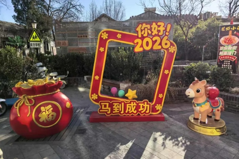 From the "Success at a Gallop" themed installations and the "Pat-a-Horse" cartoon sculptures to horse-themed photo frames and creative "sweater trees", Lanman Hutong, Nanbanjie Hutong, and Xizhuan Hutong in the Fayuan Temple Historical and Cultural Block have been revitalized with vibrant decorations celebrating the Year of the Horse.