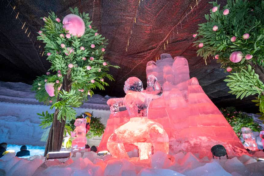 The gorge looks like a crystal palace for dragons, recreating the classic episode of "Getting Treasure from Dragon Palace" (adapted from the Journey to the West) through ice sculptures. Light effects penetrate the ice to create a magical realm highlighted by the legendary 72 transformations of the Monkey King, blending ice and snow landscapes with Chinese aesthetics to present a unique winter audiovisual extravaganza.