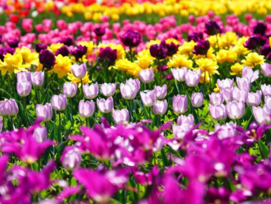Covering an area of 1,300 square meters, the flower sea features over 50,000 tulips of more than 10 varieties. In vibrant shades of red, yellow, pink, orange, and white, the blossoms create a colorful spectacle resembling an overturned palette of spring hues. The dainty flowers contrast beautifully with the surrounding, bustling cityscape, creating an enchanting atmosphere.