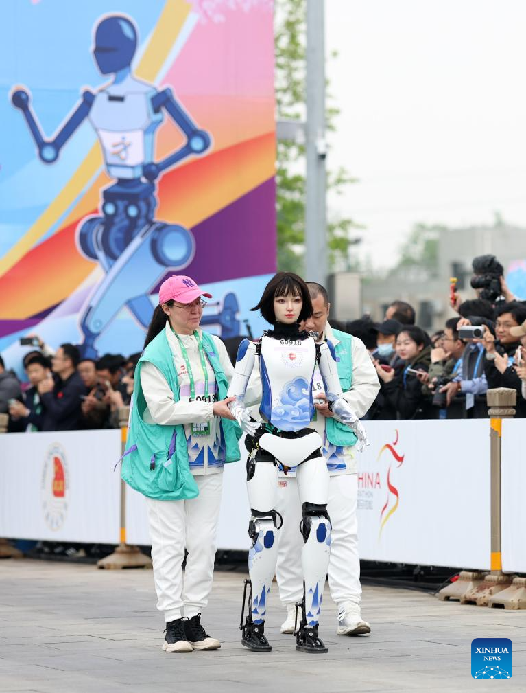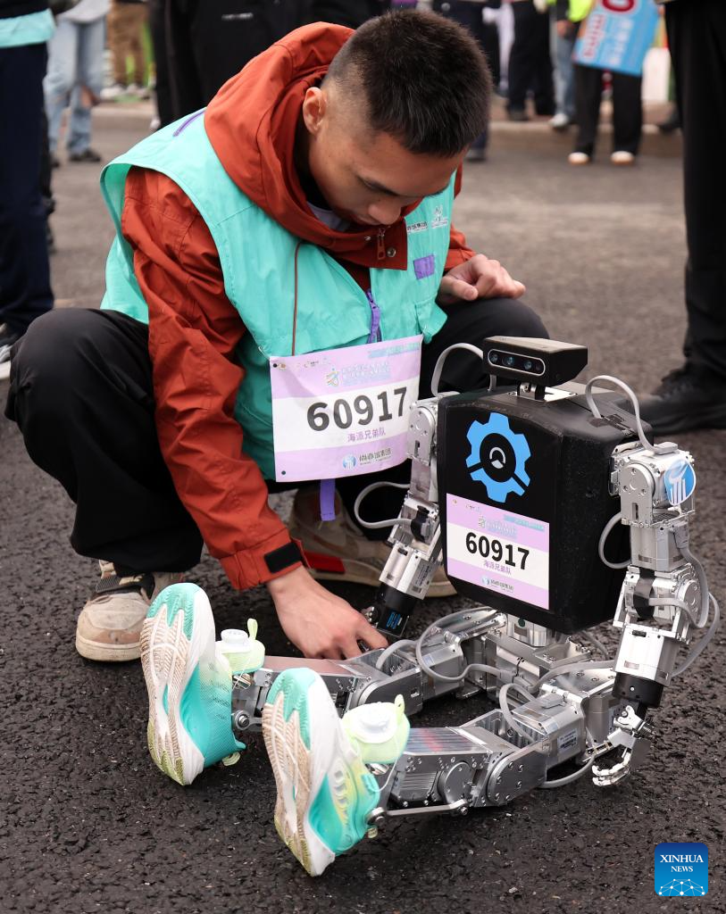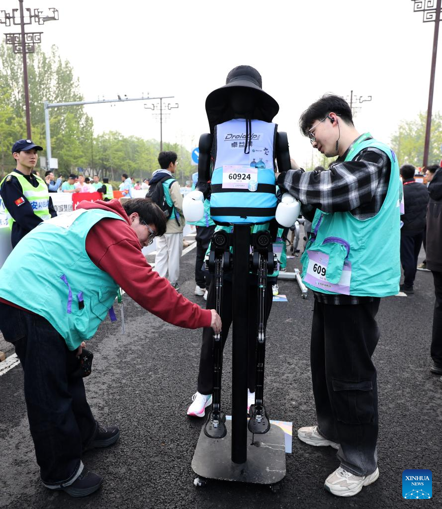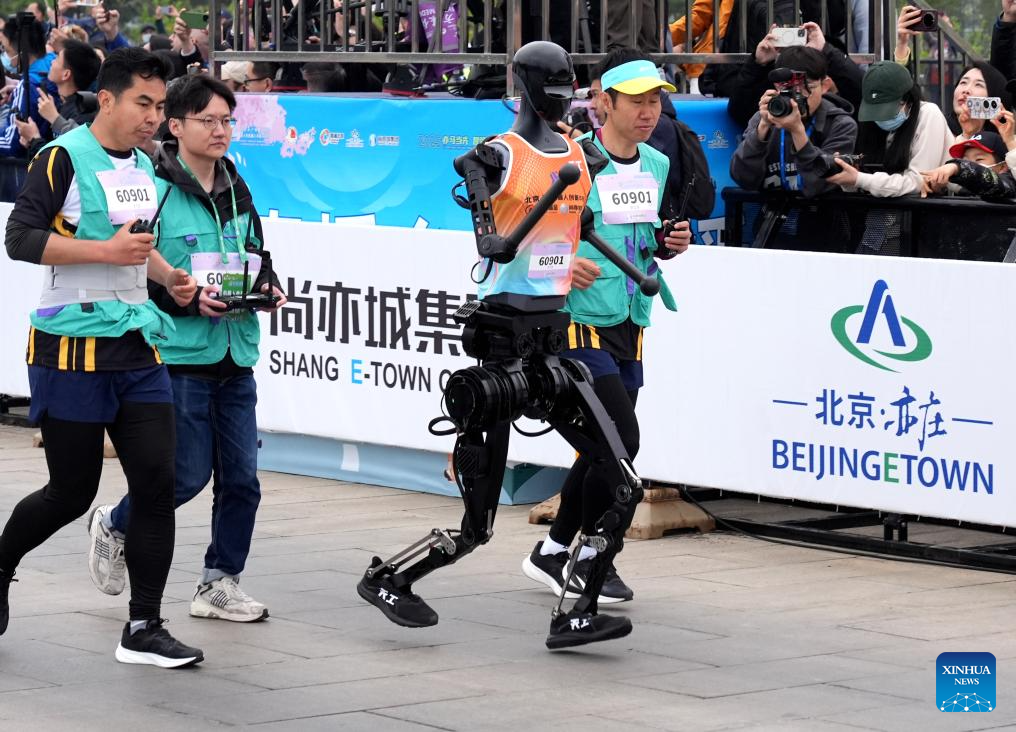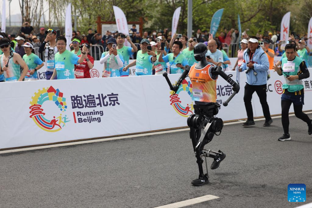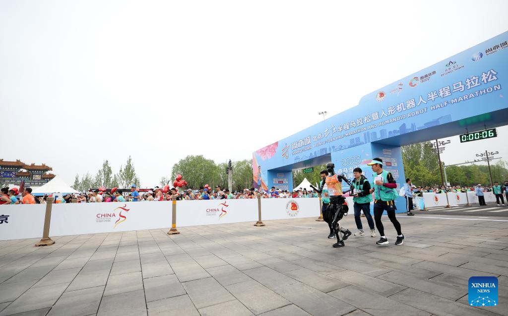 Participants compete during the Beijing E-Town half-marathon and humanoid robots half-marathon in the Beijing Economic-Technological Development Area in southeast Beijing, China, April 19, 2025. (Xinhua/Li Xin)
