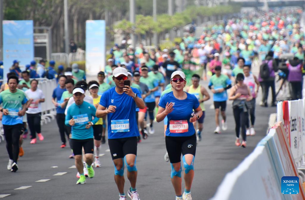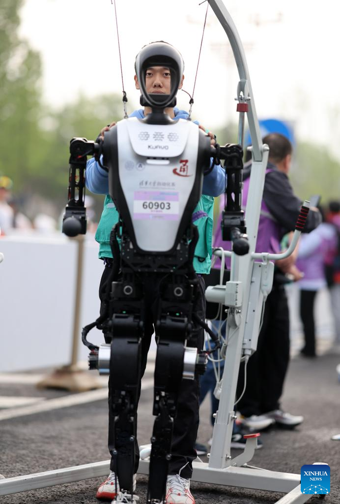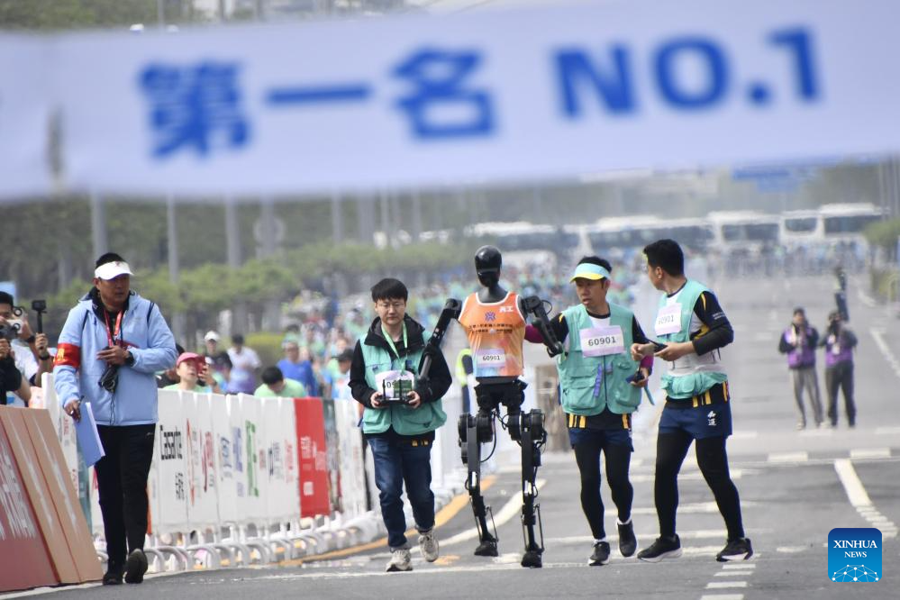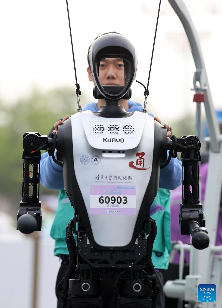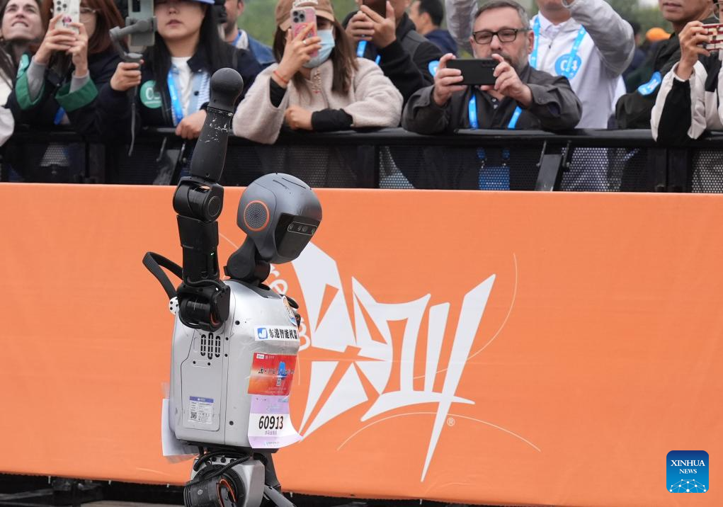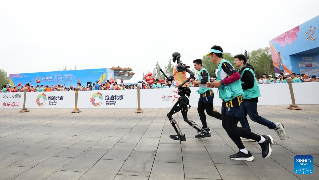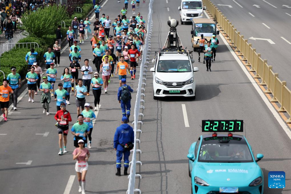 Participants compete during the Beijing E-Town half-marathon and humanoid robots half-marathon in the Beijing Economic-Technological Development Area in southeast Beijing, China, April 19, 2025. (Xinhua/Li Xin)