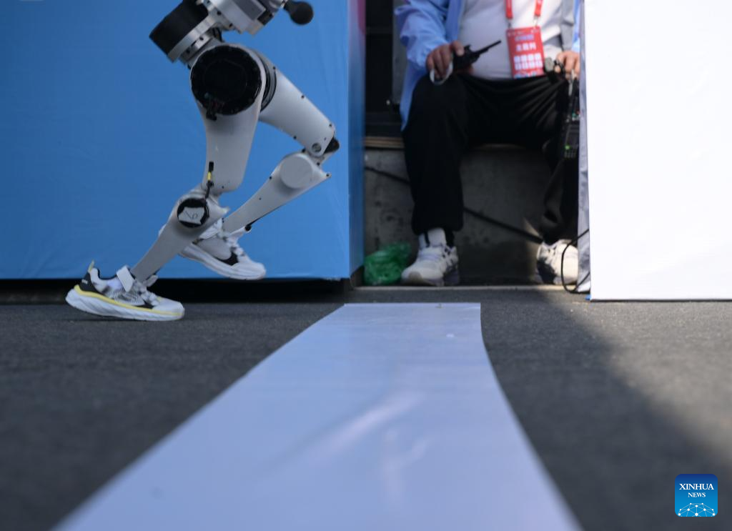Robotic participant "NOETIX N2" arrives at the finish line during the Beijing E-Town half-marathon and humanoid robots half-marathon in the Beijing Economic-Technological Development Area in southeast Beijing, China, April 19, 2025. (Xinhua/Li He)