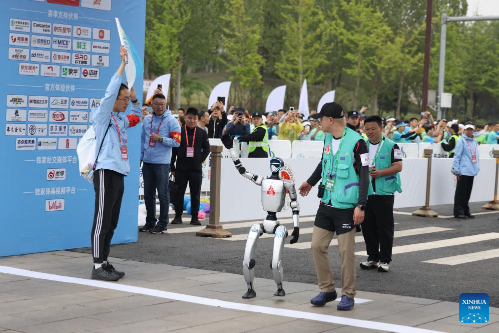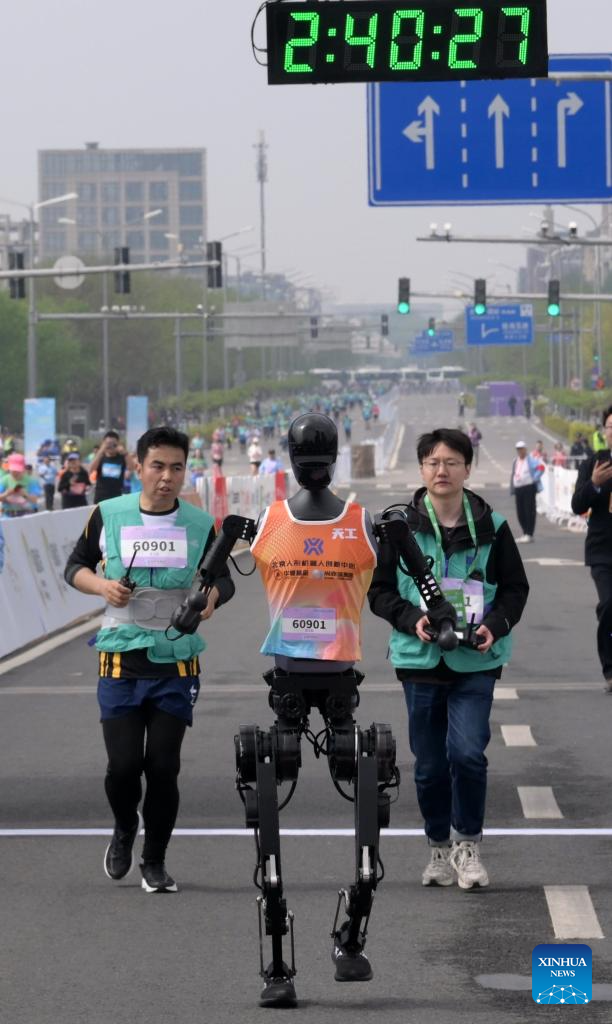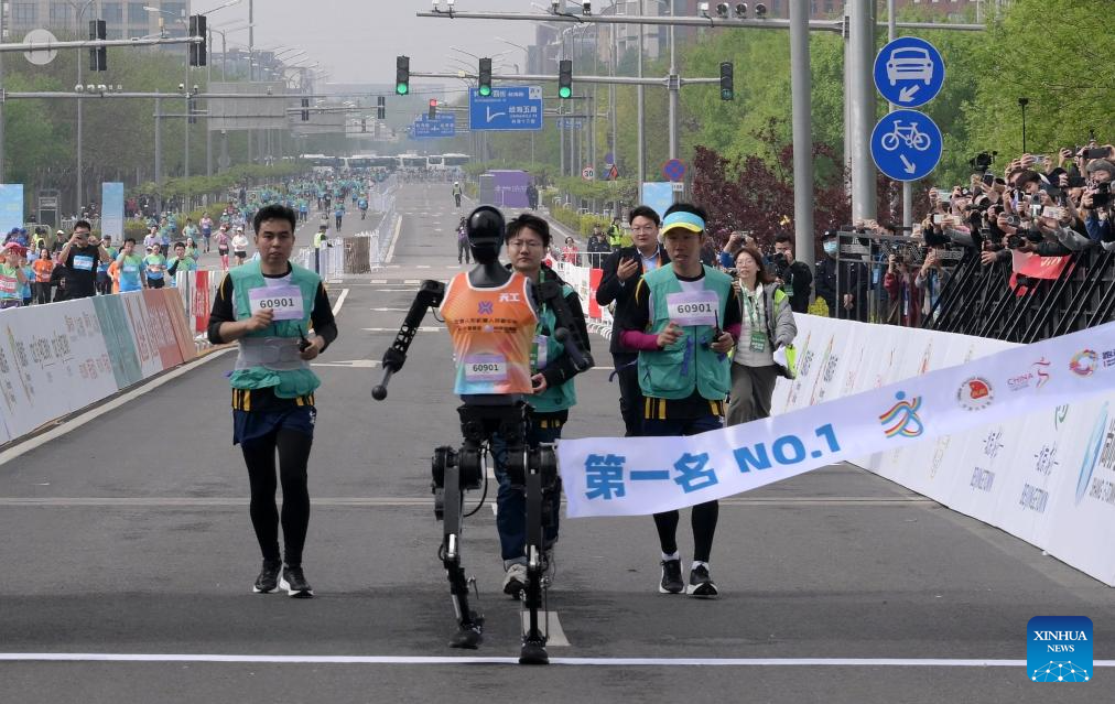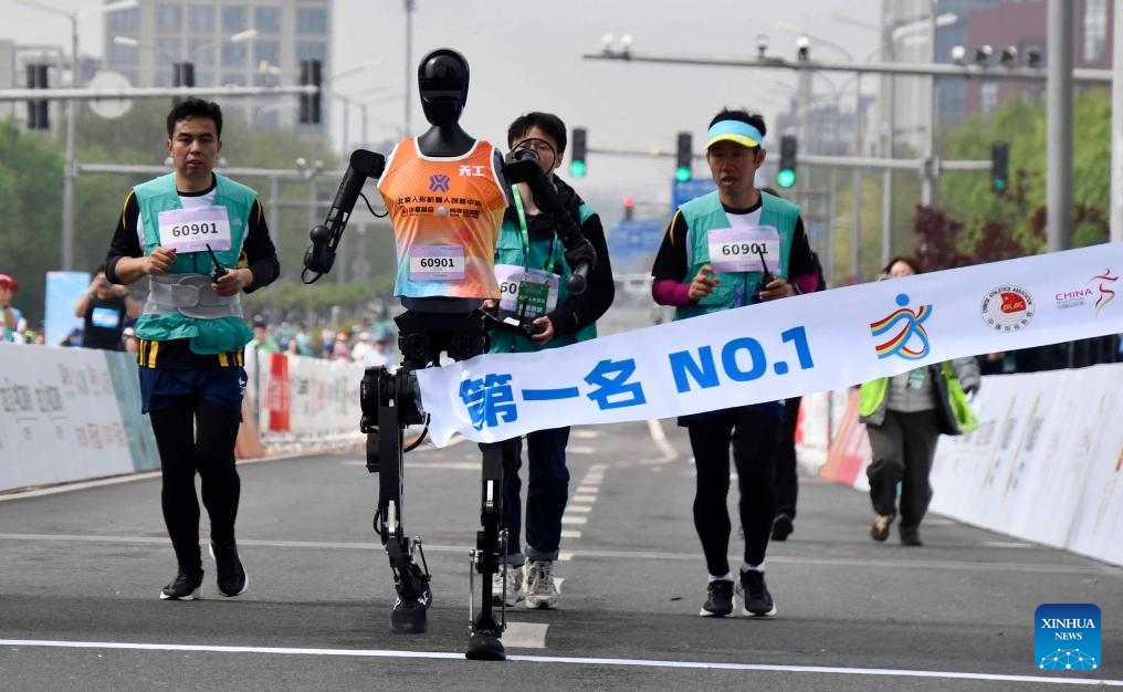 Robotic participant "Tiangong Ultra" (C) crosses with the finishing line as engineers run alongside during the Beijing E-Town half-marathon and humanoid robots half-marathon in the Beijing Economic-Technological Development Area in southeast Beijing, China, April 19, 2025. (Xinhua/Li He)