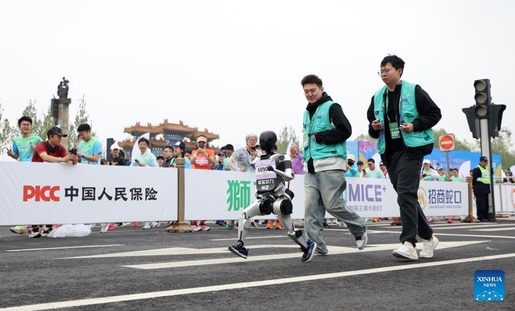 Robotic participant "Songyandongli N2" (front) competes as engineers run alongside during the Beijing E-Town half-marathon and humanoid robots half-marathon in the Beijing Economic-Technological Development Area in southeast Beijing, China, April 19, 2025. (Xinhua/Zhang Chenlin)