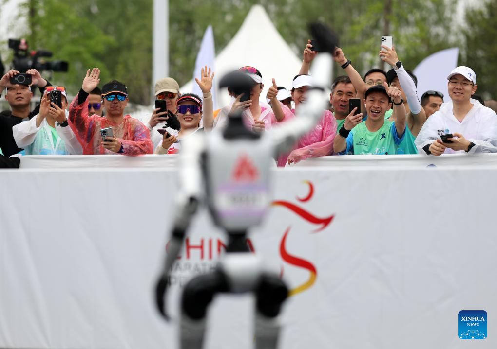 Participants wave to a robotic participant "Benben" (front) before the Beijing E-Town half-marathon and humanoid robots half-marathon in the Beijing Economic-Technological Development Area in southeast Beijing, April 19, 2025. (Xinhua/Cao Can)