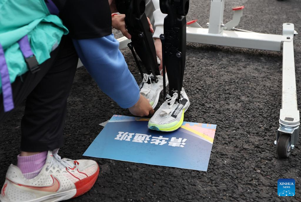 Engineers help robotic participant "Kuavo" to put on shoes before the Beijing E-Town half-marathon and humanoid robots half-marathon in the Beijing Economic-Technological Development Area in southeast Beijing, April 19, 2025. (Xinhua/Cao Can)