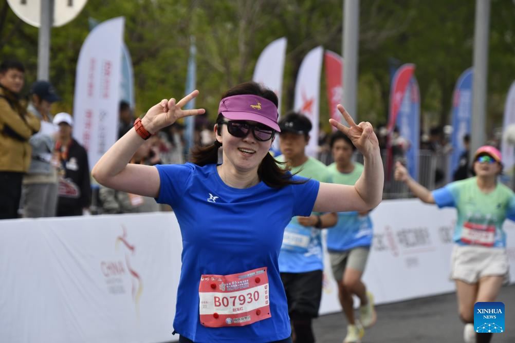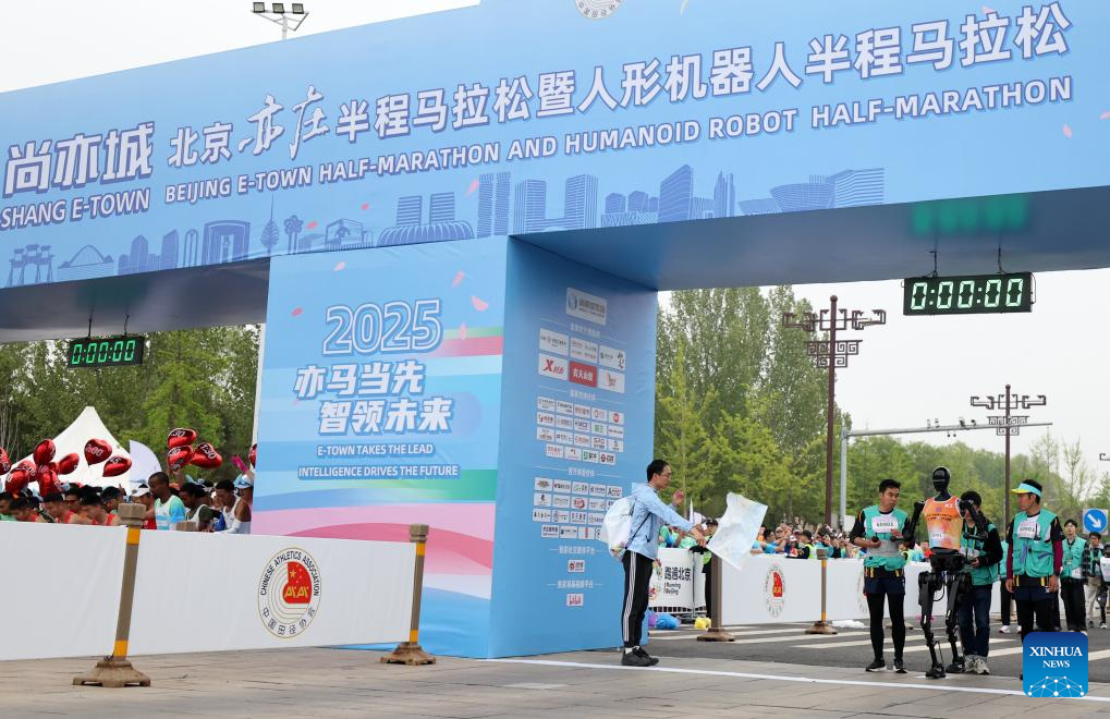Elias Desta of Ethiopia crosses the finishing line during the Beijing E-Town half-marathon and humanoid robots half-marathon in the Beijing Economic-Technological Development Area in southeast Beijing, April 19, 2025. (Xinhua/Li He)