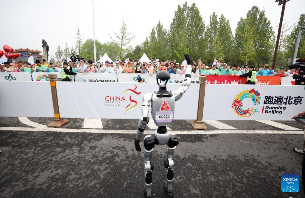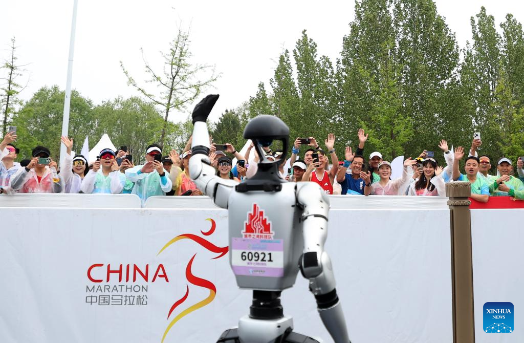 Robotic participant "0306 Xiaojuren" waves during the Beijing E-Town half-marathon and humanoid robots half-marathon in the Beijing Economic-Technological Development Area in southeast Beijing, China, April 19, 2025. (Xinhua/Zhang Chenlin)