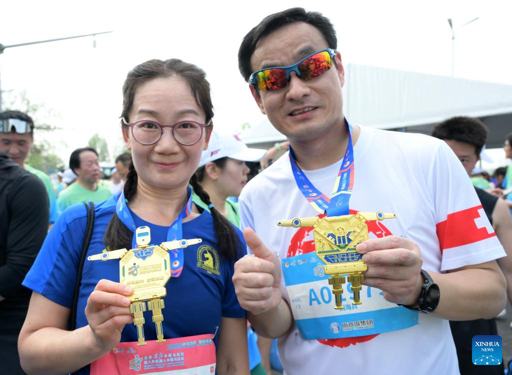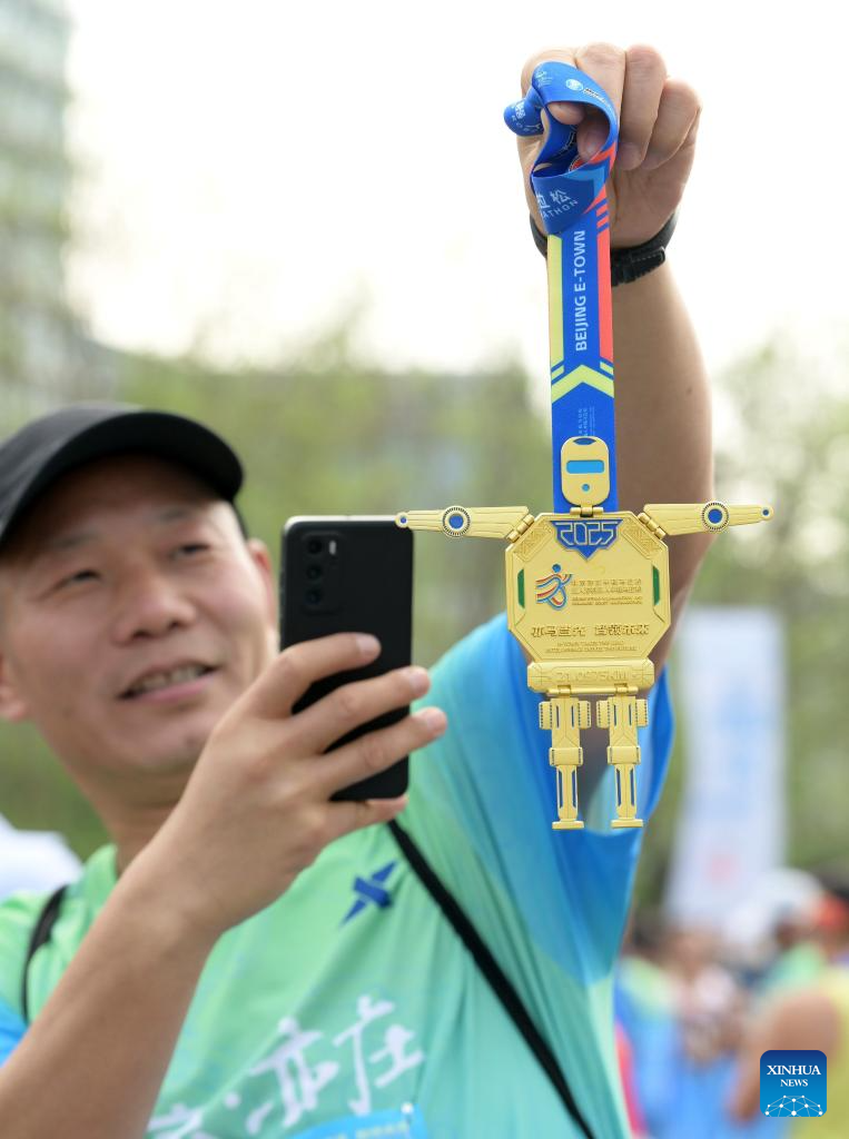 Participants show their finisher medals after the Beijing E-Town half-marathon and humanoid robots half-marathon in the Beijing Economic-Technological Development Area in southeast Beijing, China, April 19, 2025. (Xinhua/Li He)