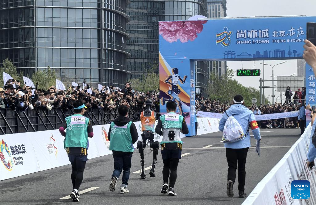 Robotic participant "Tiangong Ultra" (2nd L) crosses the finishing line as engineers run alongside during the Beijing E-Town half-marathon and humanoid robots half-marathon in the Beijing Economic-Technological Development Area in southeast Beijing, China, April 19, 2025. (Xinhua/Li Xin)