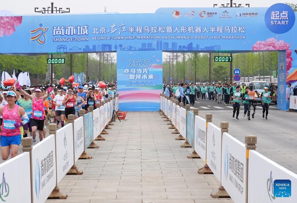 Robotic and human participants start during the Beijing E-Town half-marathon and humanoid robots half-marathon in the Beijing Economic-Technological Development Area in southeast Beijing, China, April 19, 2025. (Xinhua/Zhang Chenlin)