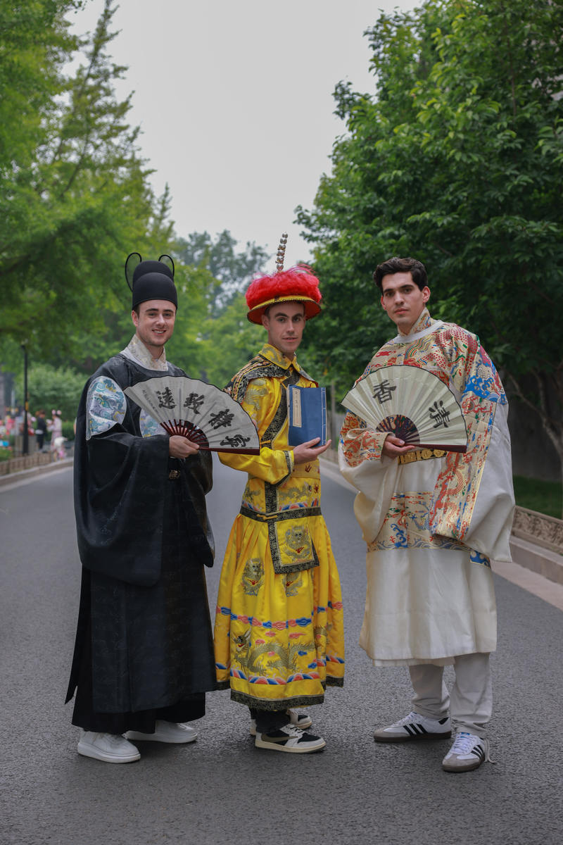On May 8, outside Donghua Gate of the Forbidden City, Australian tourists in traditional Chinese costumes posed for photos by the city's ancient moat.