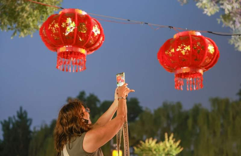 On the evening of May 16, a foreign tourist raised her phone to capture the bright red lanterns hanging high.