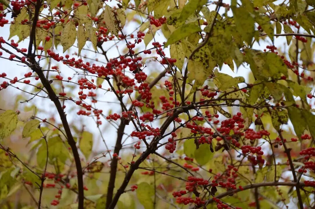 The branches grow heavy with fruit, while the bright red berries dot the forest like jewels, attracting birds like azure-winged magpies to feast on nature's bounty.
