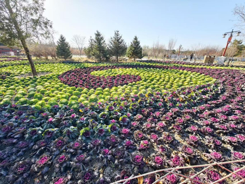 An ornamental kale-themed garden has just opened to the public in the northwest section of Jingshan Park. It covers an area of around 2,000 square meters, with the pink, purple and white kale to create a traditional "auspicious cloud" pattern, immediately attracting numerous visitors.