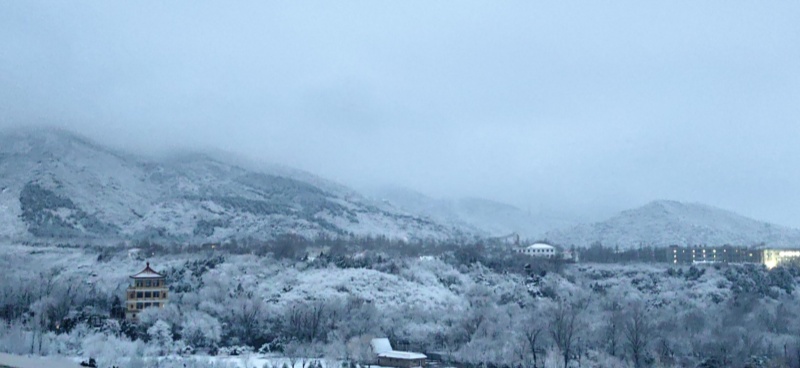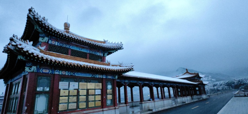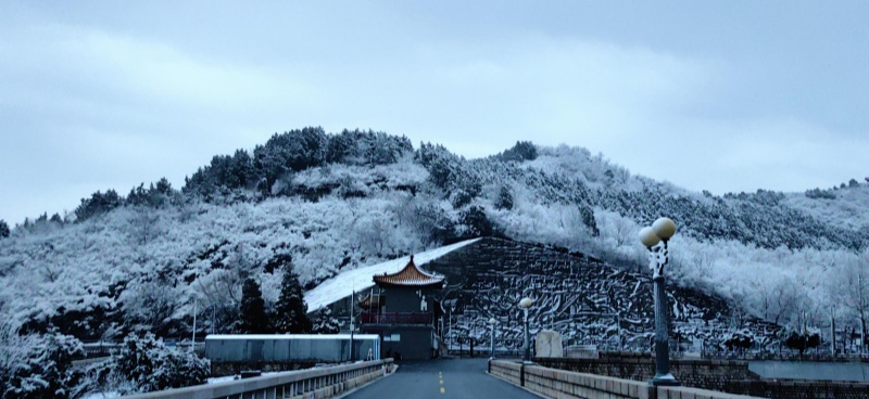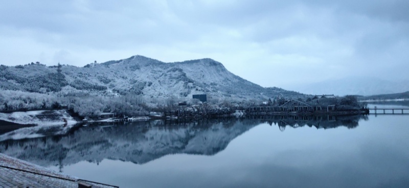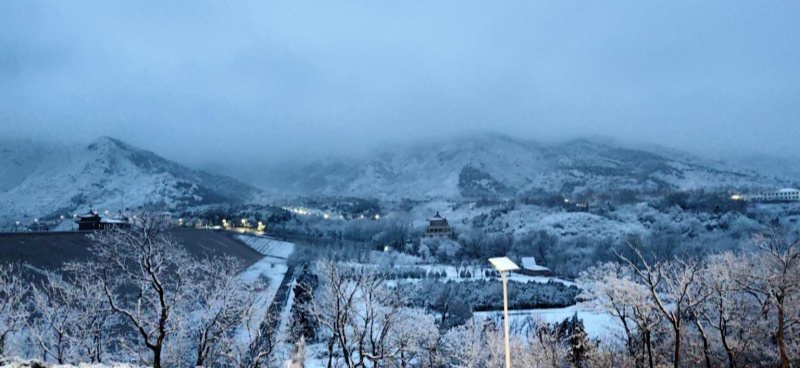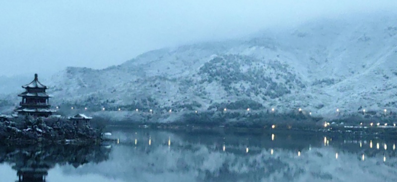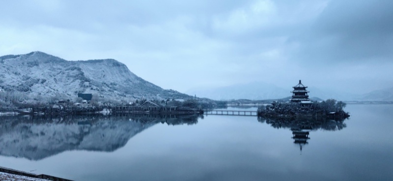 The first auspicious snowfall after the Spring Festival holiday arrived gracefully in Beijing. As the snow settled upon the mountains and the dawn broke softly, the Ming Tombs Reservoir in Changping District presented a serene scene of the lake and mountains, resembling a poetic scroll of traditional Chinese painting.