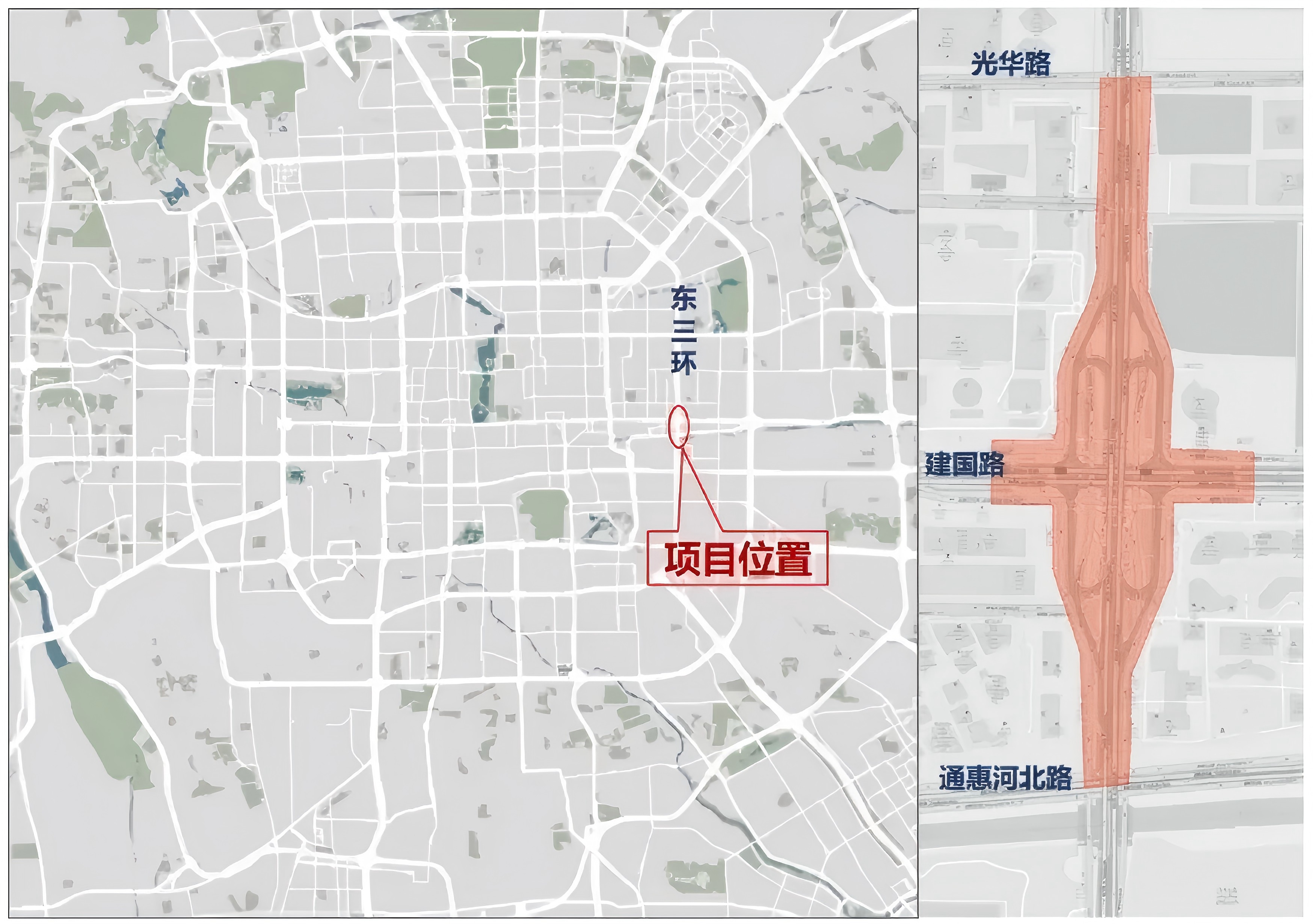 The public space renovation and upgrading project in Beijing's Guomao Bridge area is scheduled to commence in the second half of 2025, with an expected construction time of four months. The project site is located in Jianwai subdistrict of Chaoyang District, extending from Tonghuihe North Road in the south to Guanghua Road in the north.
