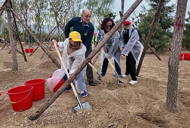 At the site, international participants worked together to dig holes, mound earth into water-retaining basins, and watered the trees together. Kazi Ziaul Hasan, Minister of the Embassy of Bangladesh in China, praised the Beijing International Friendship Forest initiative as highly meaningful, as it brought great benefits to environmental protection and people's lives. He wished the event continues for years to come.