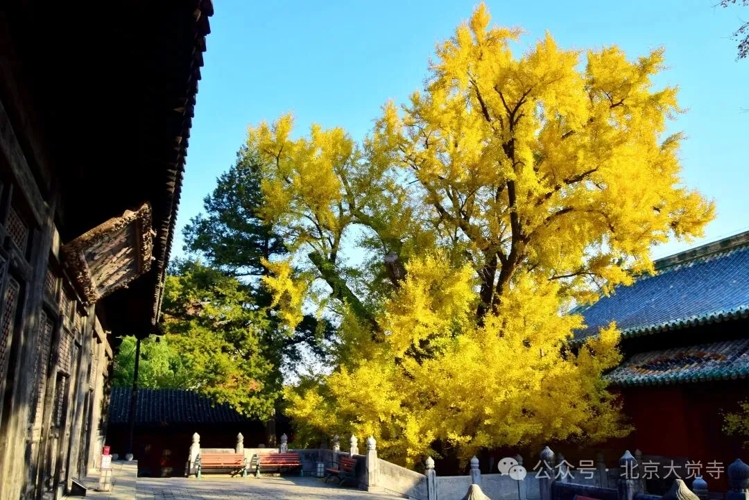 Dajue Temple houses four ginkgo trees. In front of Amitabha Hall (无量寿佛殿) stand two trees, with the one in the north dating back over 1,000 years, revered as the "King of Ginkgo Trees of the Western Hills". Its golden leaves are truly breathtaking. The tree in the south, a female, bears abundant fruit every autumn.