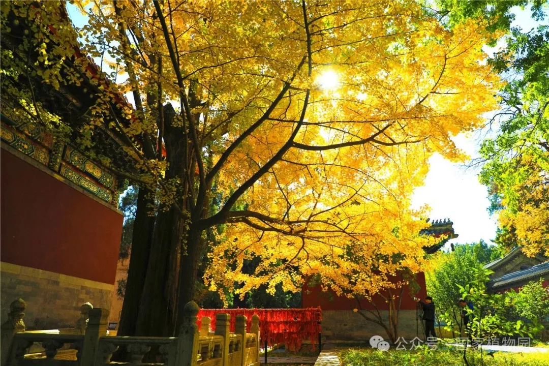 In the North Garden of the China National Botanical Garden, two ginkgo trees about 800 years old stand on either side of the Hall of the Three Buddhas (三世佛殿). As autumn deepens, their fan-shaped leaves turn a brilliant yellow, glowing against the red temple walls — a timeless scene of autumn beauty.