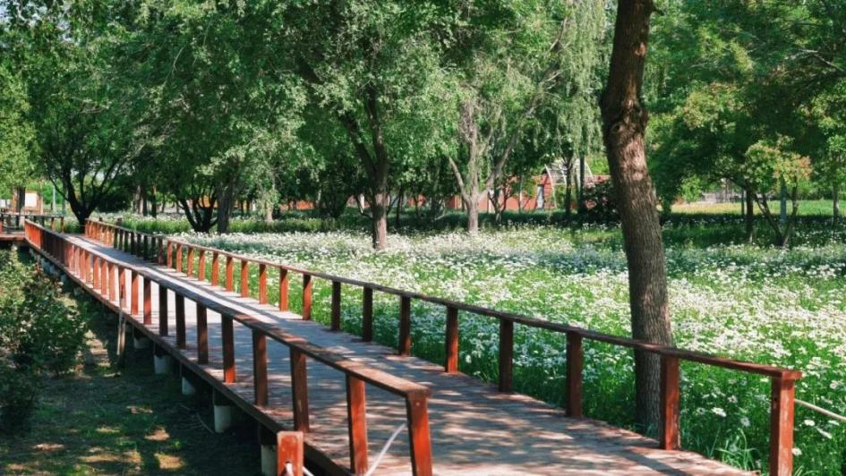 At Heyi Farm Wetland Park, clusters of white shasta daisies bloom along the water's edge. As the park is adjacent to Nanyuan Forest Wetland Park, visitors can head there after admiring the oxeye daisy fields to immerse themselves in the stunning sea of cosmos flowers.