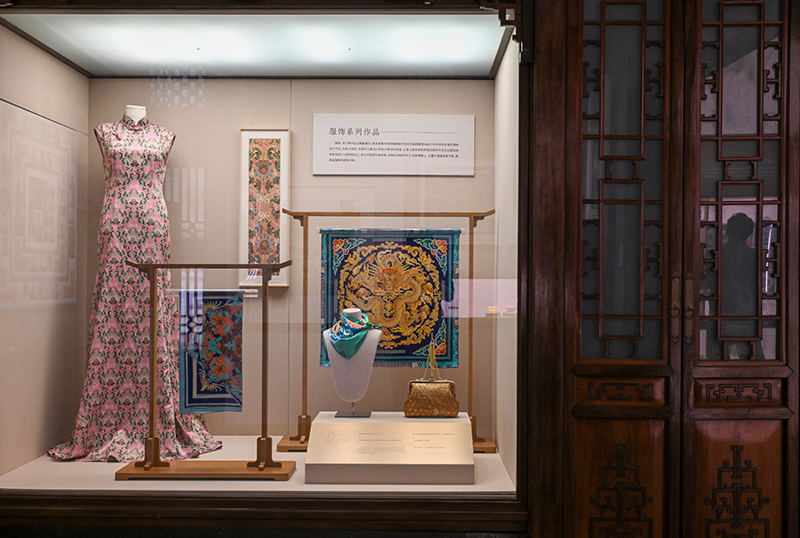 Clothes and accessories with Caihua elements in designing are displayed during the exhibition titled "A Thousand-Year Legacy of Caihua: Inheritance and Innovation in Official-Style Chinese Architectural Polychrome Painting" held at the Palace Museum in Beijing, capital of China, May 26, 2025. The exhibition, officially opened to the public on Tuesday, showcases 43 pieces of ancient Chinese Caihua items and Caihua artworks from students supported by China National Arts Fund.