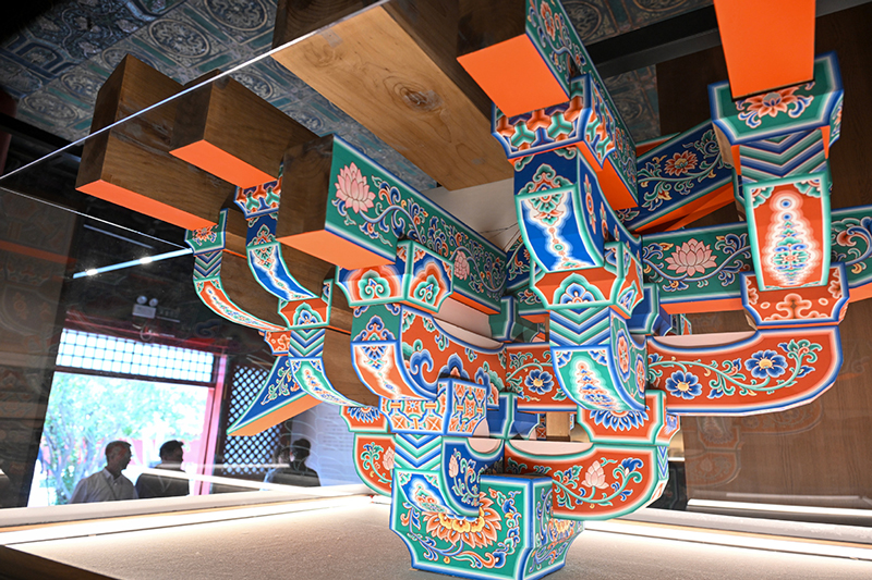 An ancient architectural component decorated with Caihua is displayed during the exhibition titled "A Thousand-Year Legacy of Caihua: Inheritance and Innovation in Official-Style Chinese Architectural Polychrome Painting" held at the Palace Museum in Beijing, capital of China, May 26, 2025.