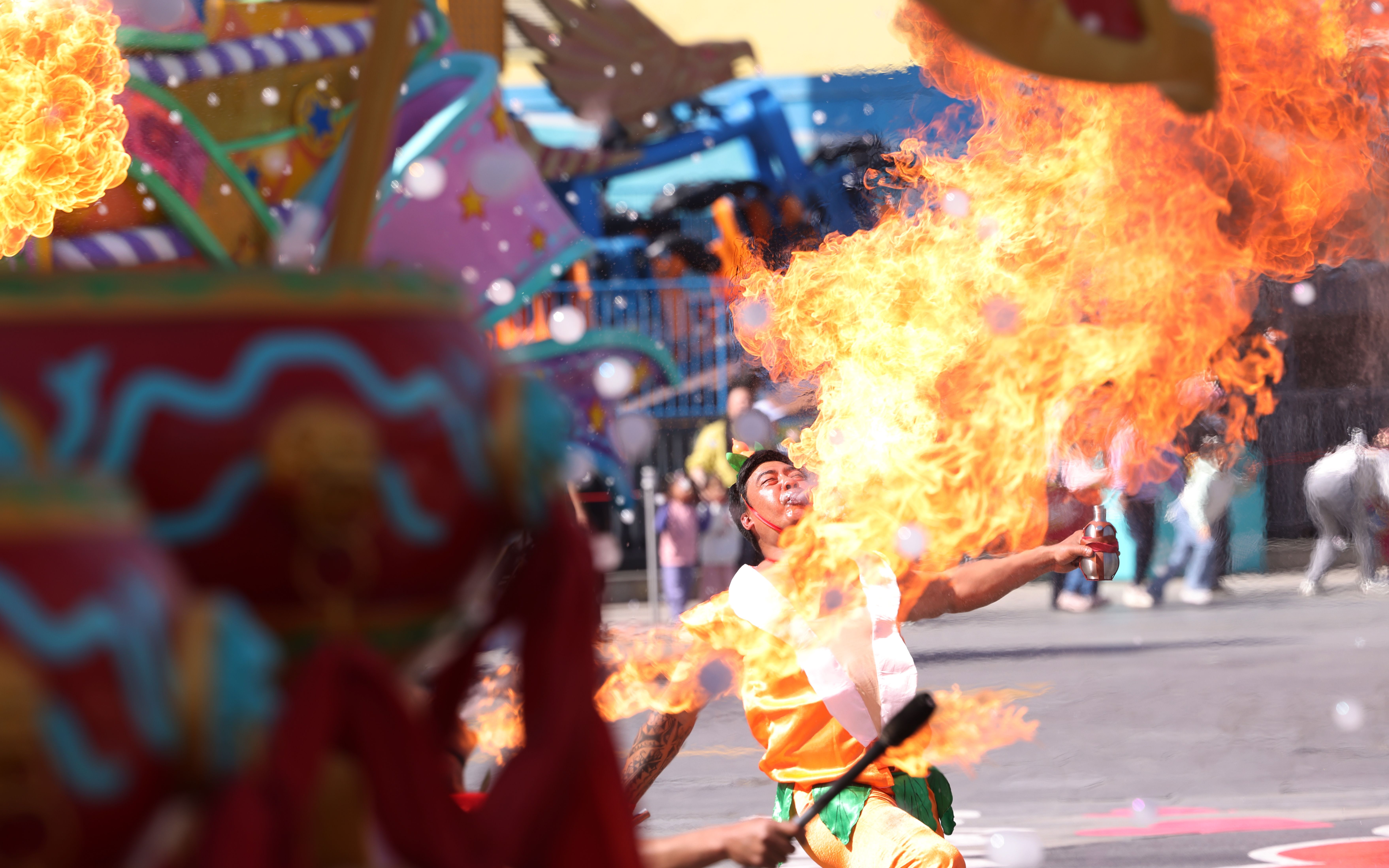 A Performer dressed as the characters from "Calabash Brothers", a Chinese animated series, wows audiences with his fire-breathing show.